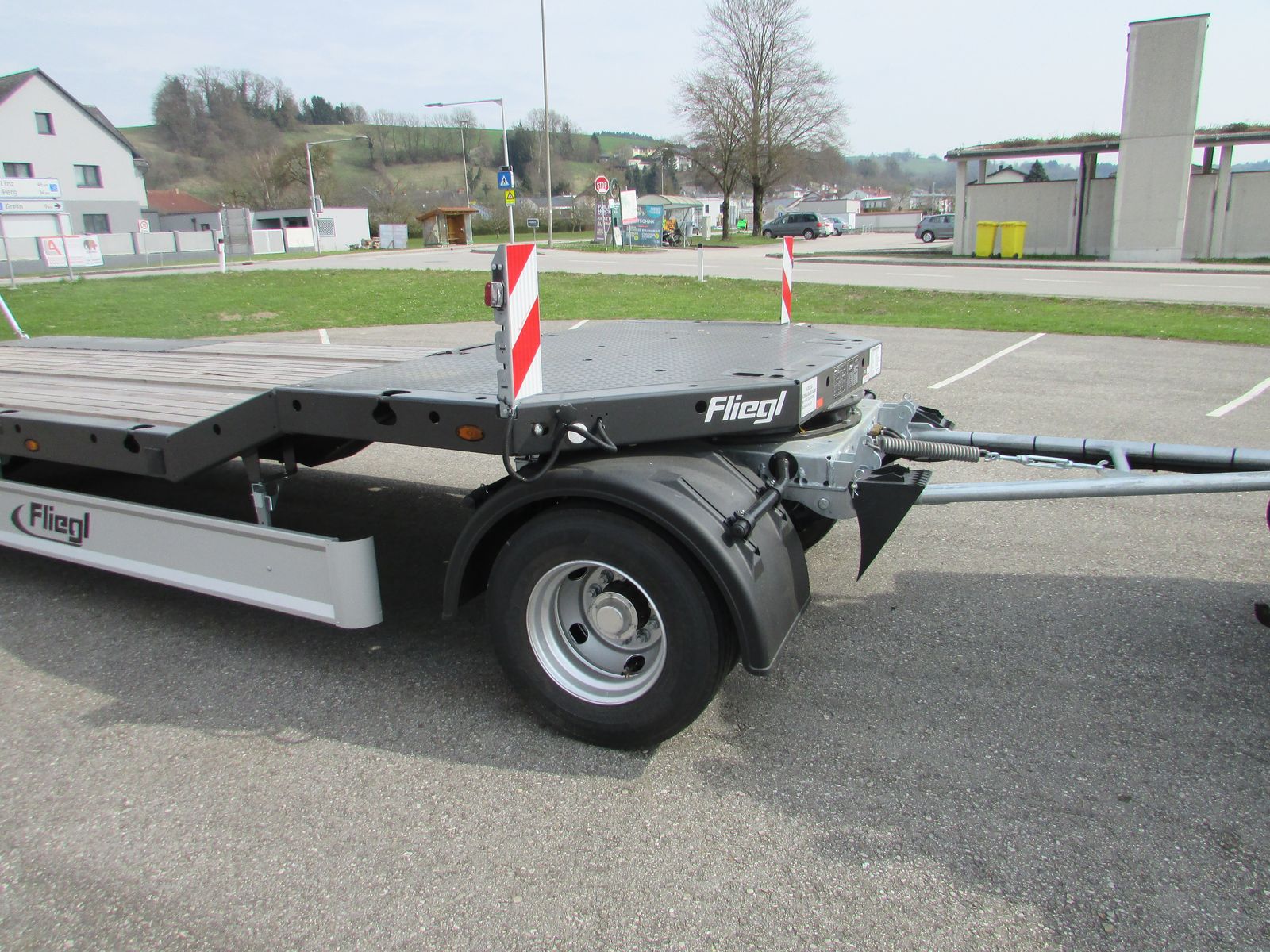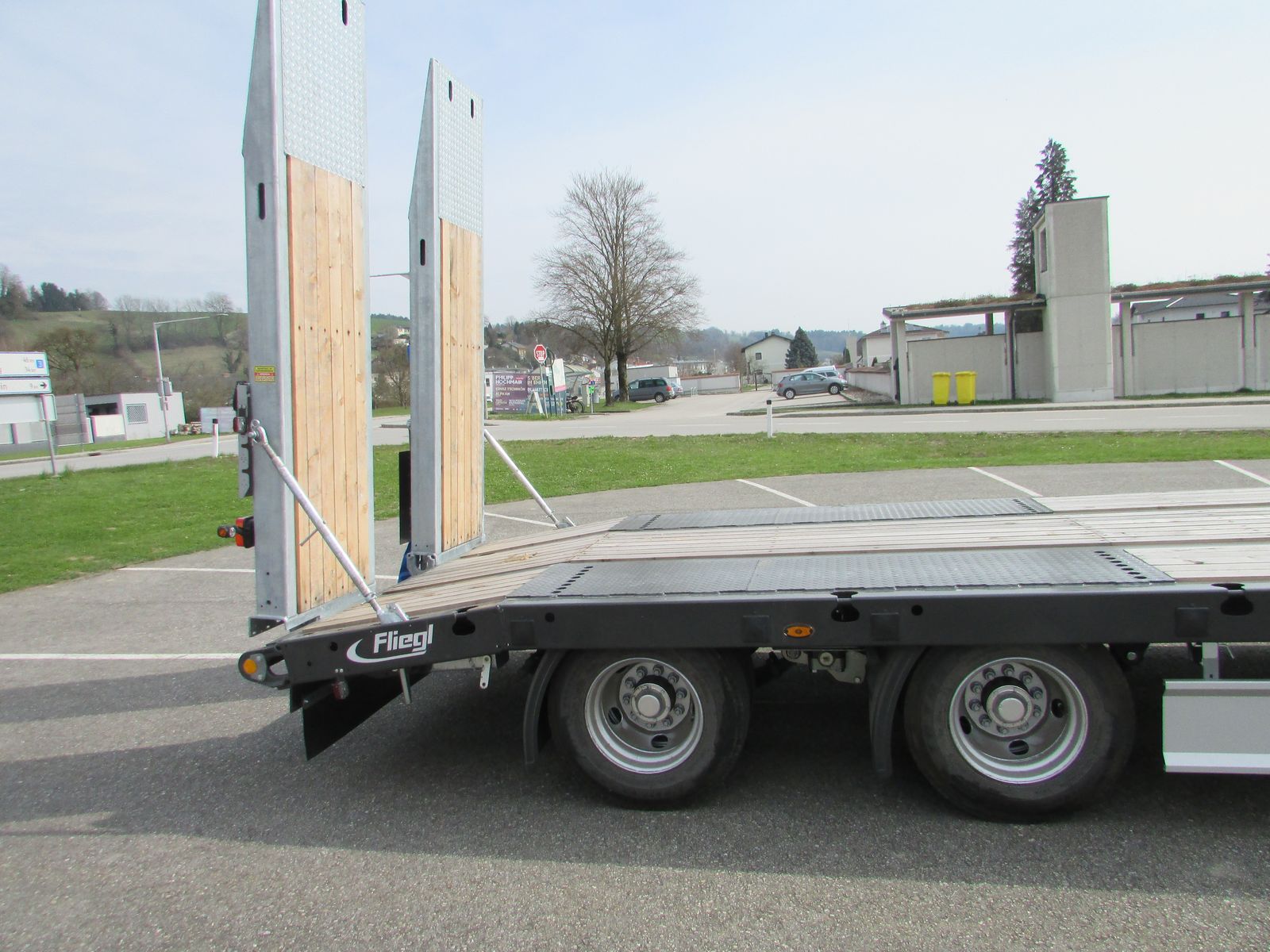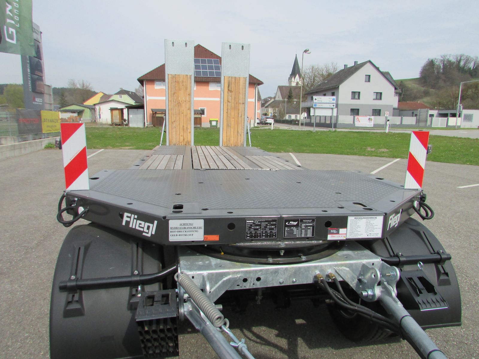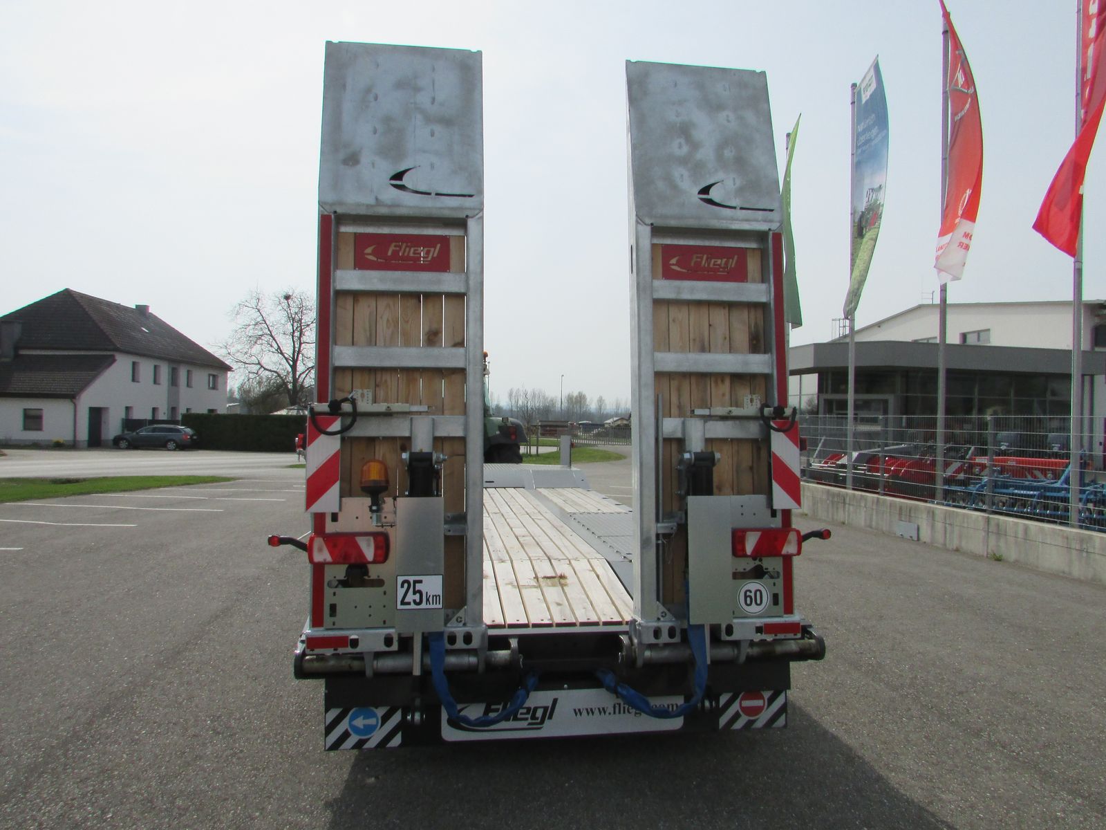 Fliegl DTL300 Dreiachs Tieflader DTL 300 Agrar Greenlight + Gesamtgewicht zul. / techn.: 24000 / 30000 kg + Nutzlast zul. / techn. ca.: 18400 / 24400 kg + Leergewicht (Basisversion) ca.: 5600 kg +/- Bautoleranz + Gesamtlänge ca.: 10290 mm + Gesamtbreite max.: 2550 mm + Länge Kröpfung ca.: 2170 mm + Länge Tiefladeplattform inkl. Heckanschrägung ca.: 5900 mm + Länge Heckanschrägung ca.: 950 mm + Ladehöhe im Tiefbett beladen ca.: 860 mm + Anhängehöhe ca.: 900 mm + Zuggabellänge ca.: 1900 mm + Drehschemel mit kräftigen Kugeldrehkranz + Heckabstützung klappbar + Unterlegkeile mit Halter + Halbschalenkotflügel 1. Achse + Viertelschalenkotflügel hinter 2. und 3. Achse + Seitenanfahrschutz + Seitlich gelbe LED Beleuchtung, dann ohne Reflektoren + Österreich Paket für größer 25 km/h und max. 40 km/h Zulassung in Österreich + Spritzlappen hinten über gesamte Breite + 1 Paar Zurrausschnitte im Längsträger vorne auf Kröpfung eingelassen, je 10 to. + 7 Paar Zurrpilze oben und seitlich im Außenrahmen eingelassen je 10to - 1 x vorne auf Kröpfung - 5 x im Tiefbett - 1 x in Heckanschrägung - 12 Paar Zurrlöcher im Außenrahmen mit je 5 to. (Spanngurteinhängung) - 5 x Kröpfung, - 6 x Tiefbett - 1 x in Heckanschrägung + Zuggabel mit geprüfter 40 mm Zugöse + Zuggabelhöheneinstellung über Feder + Parabelfederung mit wartungsfreier Stahl-Gummi-Lagerung und mechanischem Achslastausgleich (Wippenausgleich) + Bereifung 235 / 75 R 17,5", Stahlfelgen in Zwillingsanordnung + 2-Leitungs Druckluft Bremsanlage ohne ABS, aber mit mechanischen ALB + Federspeicher-Feststellbremse + 12 Volt, Mehrkammerleuchten, seitlich gelbe LED Beleuchtung seitlich gelbe LED Beleuchtung + Auffahrtsrampen hydraulisch klappbar sofort einsatzbereit sofort verfügbarZul. Gesamtgewicht (t): 24